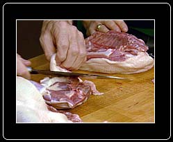 Trim the extra skin from the breasts and legs, and cut it, along with any extra fat from inside the duck, into 1" pieces for cracklings. |
