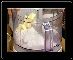 Cut the cold butter into 1/4" slices, and add to the flour, along with the salt and sugar. |