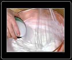 In another bowl, whip the egg whites until holding a peak but not too firm, add the sugar, and beat for 5-10 seconds. |
