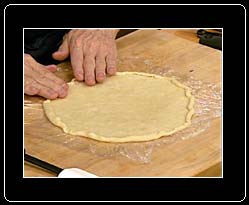 Preheat oven to 400°. Remove dough round from the refrigerator, and place on a large cutting board. Peel off plastic wrap. Trim the edge to make the dough round, then fold the edge in on itself to form a border. |