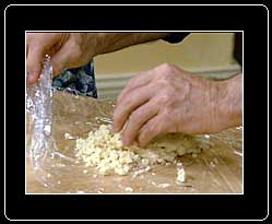 Turn it out onto a large piece of plastic wrap. Form it into a loose mass. |