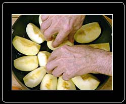 Arrange apple quarters on top of the caramel skin side down in one layer. You will use 20-24 pieces. |