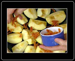 Sprinkle on the apricots and nuts, and dot with butter. |