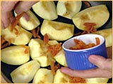 Arrange apple quarters on top of the caramel skin side down in one layer.