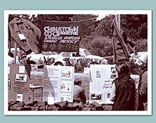Chinatown Co-operative, 1972, display table at a park. As an alternative to company sewing factories and their exploitive conditions, community activists and workers ran a garment factory in the workers' interest using the co-operative, or "co-op" approach. The Chinatown Co-op took contract work, but also produced and sold denim versions of the then-popular Mao jacket. |