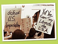 Anti-war demonstration, Chinatown, San Francisco, c. 1972. Revolutionary ideas, including anti-capitalist and pro-socialist sentiments, grew significantly during the late '60s and '70s among activists. Many influential people and organizations involved with the time period's various social movements saw capitalism as a force causing "human misery around the world," as Warren Mar asserts (see text below). |